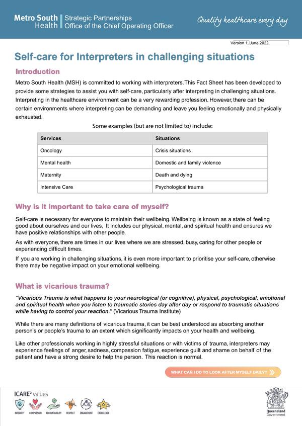 This fact sheet has been developed to provide some strategies to assist you with self-care, particularly after interpreting in challenging situations, and explores: